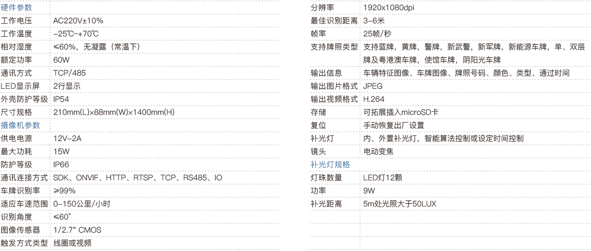 ·外观颜色主要由黑灰色组成 ·内置200W高清摄像机一体集成并配备LED显示屏、补光灯,可以显示车辆进出场信息和车辆类型语音播报 ·脱机计费 ·多样化电子支付 ·安装调试简单 ·人性化语音提示,同步设备屏显双向引导 ·多车位多车管理 ·快速接入云平台管理 ·商户打折优惠管理 ·32路视频监控管理